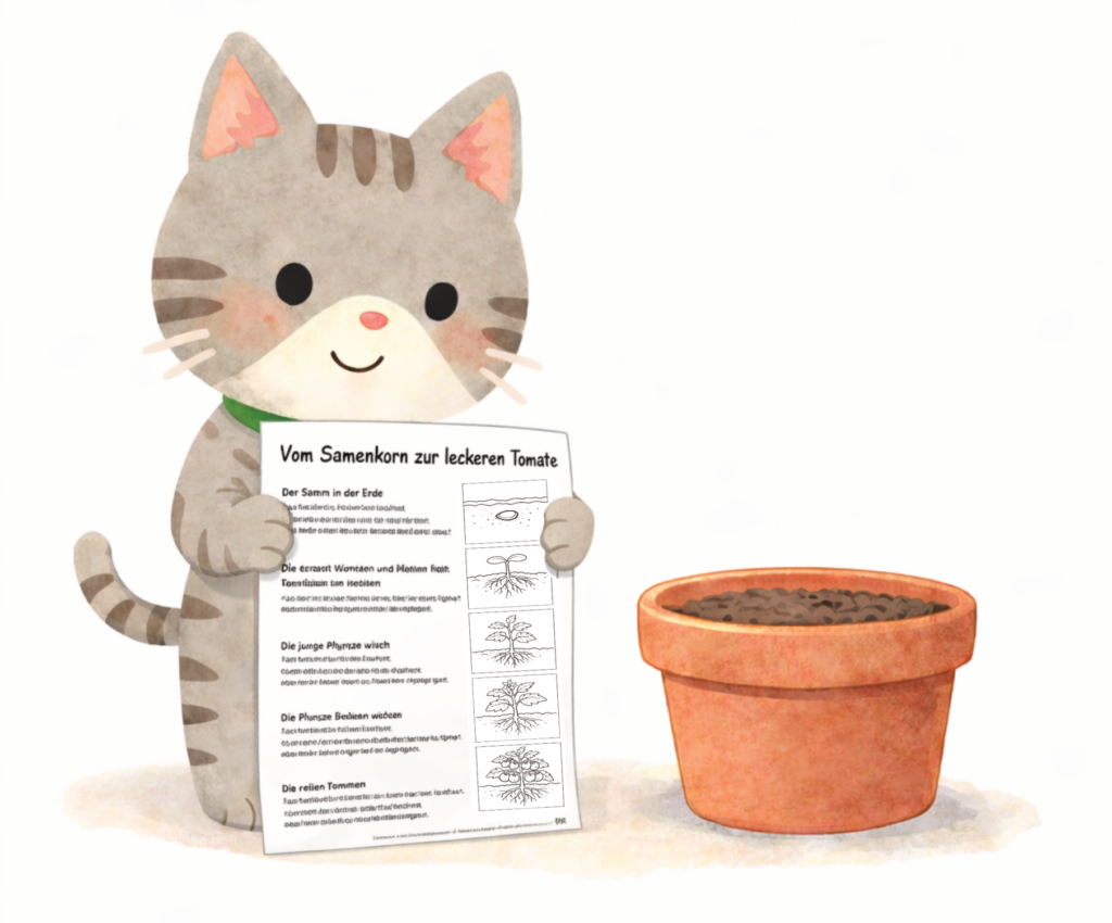 Zu diesem Thema habe ich ein liebevoll gestaltetes Arbeitsblatt erstellt, das Kinder gemeinsam mit Eltern, Erziehern oder Lehrern für ihr Pflanzenprojekt nutzen können. Die einzelnen Entwicklungsstufen der Tomatenpflanze sind kindgerecht dargestellt und können ausgemalt werden.