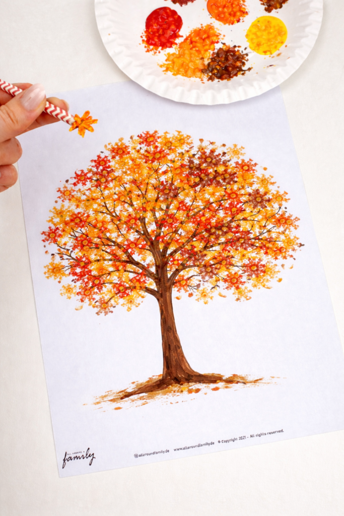 Besonders schön: Beim Stempeln gibt es kein „richtig“ oder „falsch“. Jeder Herbstbaum darf anders aussehen – genau so, wie es für dein Kind passt.