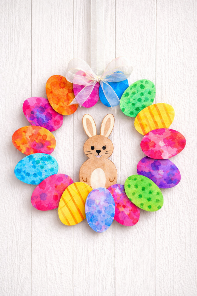 Dieser fröhlich-bunte Osterkranz ist eine wunderschöne Bastelidee für die Osterzeit und lässt sich ganz entspannt gemeinsam mit Kindern umsetzen. Er eignet sich perfekt als Tür- oder Wanddeko und bringt sofort Farbe und gute Laune ins Haus.